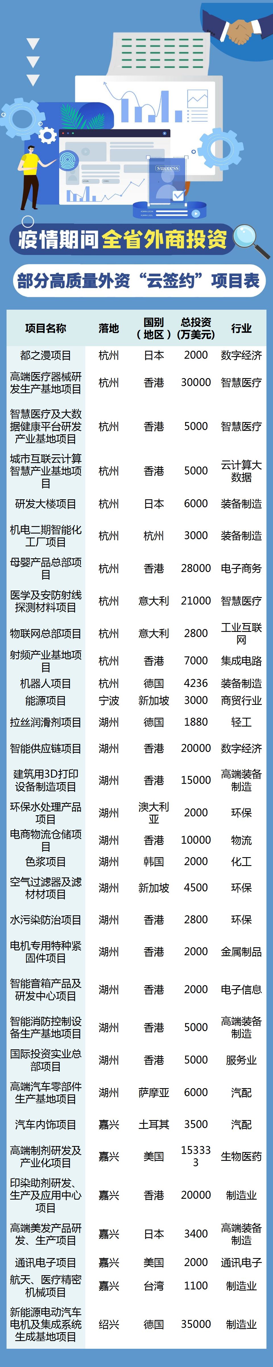 疫情发生以来,全省通过“云签约”外资项目74个,总投资62亿美元,折合人民币435亿元,其中:亿元以上外资项目超30个,主要涉及先进制造、高端装备、新材料、新能源、数字经济、生命健康、现代商贸、文化旅游等产业。 如杭州市召开“战疫情促发展”工作推进会,11个外资项目通过“云签约”落户,总投资11.41亿美元。宁波市召开重点项目网上签约会,有8个外资项目通过“屏对屏”网上签约,总投资4.1亿美元,市县政府主要领导在签约会上进行表态发言。嘉兴市网上签约37个外资项目,总投资34.3亿美元,其中亚瑟医药高端药物研发及产业化项目,总投资105.8亿元。湖州市实施专人“一对一”项目跟踪,网上签约16个外资项目,总投资8.1亿美元。绍兴市与德国投资方通过“云签约”引进新能源汽车关键零部件全球化输出项目——卧龙采埃孚合资公司总部,总投资3.5亿欧元。温州市精心谋划推出了以“牵手云上 投资温州”为主题的系列云招商系列活动,通过微信、抖音、快手等网络平台向全国现场直播,并得到央视报道。丽水市通过“云签约”,协议利用外资0.71亿美元。