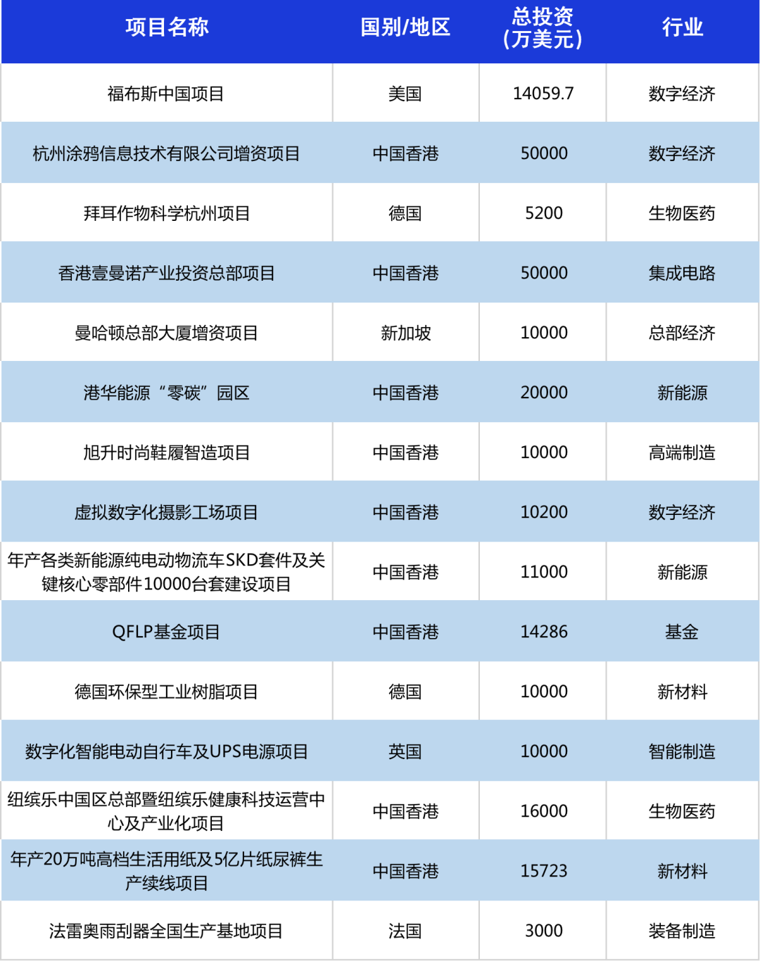 现场集中签约 战略合作协议1个 重大外资项目15个,总投资25亿美元 “走出去”投资项目1个,总投资1300万美元 本届进博会期间 共签约外资项目64个,总投资101亿美元 其中,世界500强和行业龙头企业投资项目共14个 签约情况简介 签约的外商投资项目主要来自美国、德国、英国、日本、新加坡和中国香港等国家和地区,包括拜耳作物科学、吉利德科学、费森尤斯、纽缤乐健康科技等生命健康项目,恒源新能源电动物流车及核心零部件、湛新环保树脂新材料、芯片等制造业项目,涂鸦智能、福布斯中国、Boxone虚拟工场等数字经济项目,港华“零碳”园区等生产性服务业项目。 近年来,浙江聚力招大引强,瞄准世界500强和头部企业,大力建设先进制造业“415X”产业集群,致力于发展海洋产业,打造全国绿色低碳循环发展新标杆,推动现代服务业强省建设,努力打造数字经济、新材料和生命健康三大科创新高地,着力引进一批“大好高”项目。同时,大胆探索层次更深、力度更大的开放举措,浙江自贸试验区、外商投资负面清单管理制度、数字化改革等举措加快落地,国际一流营商环境加快形成,浙江成为许多外商投资企业的共同选择。在第四届进博会期间签约的64个外资项目落地率94%。 本届进博会期间签约的项目,如吉利德科学是首次参展本届进博会,与杭州拱墅区政府签署战略合作协议,借助其全球在抗病毒、肿瘤治疗与炎性疾病方面的创新优势,共同促进浙江省生物医药产业发展。Allnex湛新是工业涂料树脂的全球领跑者,近年来持续布局嘉兴,独山港基地将建成为湛新全球最大的单一工厂,是中国区以及全球业务未来发展的基石。全球化物联网开发平台服务商领跑者涂鸦智能,已连续三年在进博会期间与杭州市签署增资协议追加投资,企业表示将致力于持续迭代技术和服务能力,帮助垂直行业完成智慧转型,助力浙江数字经济发展。福布斯中国将充分运用“媒体+服务+投资”的方式与浙江展开深度合作,通过多维度合作,助力推进一批特色产业集聚和一批重点产业项目落地浙江。 这些项目对于提升浙江产业能级与核心竞争力,推动浙江高质量发展,助推浙江“两个先行”建设起到了重要作用。