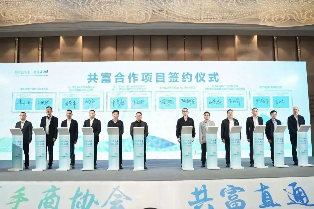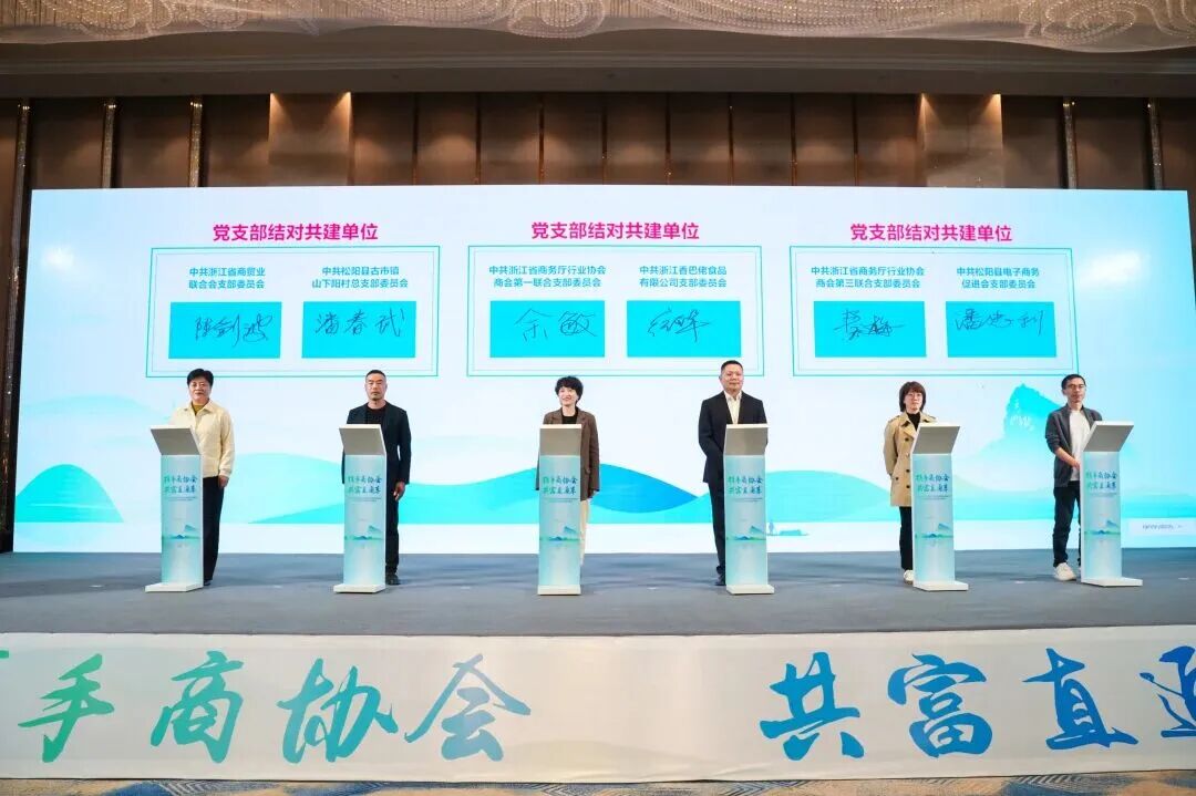 会议现场,省商务系统商协会3个党支部与松阳县山下阳村等党支部完成结对共建签约。松阳县“村社联动”组团式帮扶项目、浙江口口夸食品有限公司休闲农副食品加工项目等共18个项目现场签约,总金额超10亿元,涵盖食品餐饮、运输设备制造、生物科技、工程建设、商贸流通等行业。其中,农产品采购项目6个,产业投资项目6个,项目合作6个,持续凝聚党建引领山海共富的强大合力。