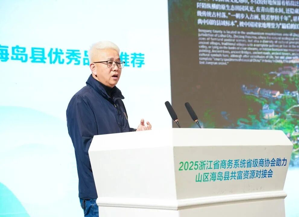 10月30日下午,“2025浙江省商务系统省级商协会助力山区海岛县共富资源对接会”在丽水市松阳县召开。省商务厅党组成员、副厅长陆勇,丽水市人民政府副市长周和平出席对接会并致辞。浙江省商务厅、省委社工部、省政协办公厅、省民政厅、省农业农村厅、省供销社、九三学社省委会、丽水市政府、山区海岛县商务部门,省商务系统商协会及会员代表共200余人参会。