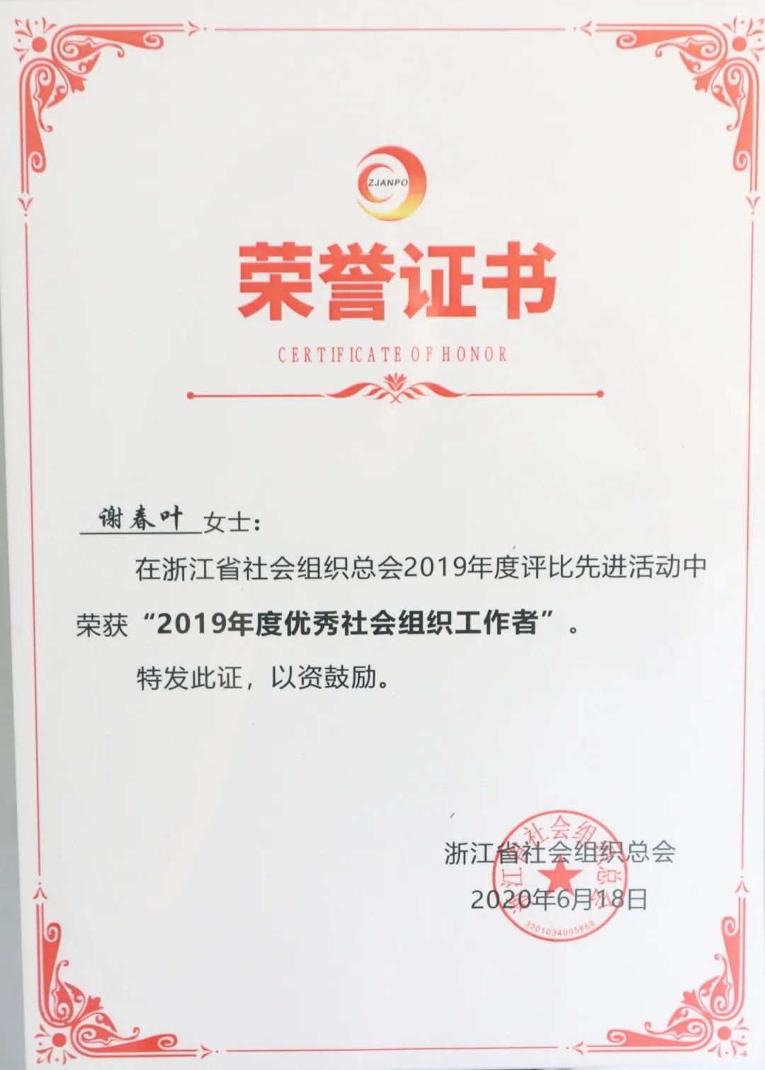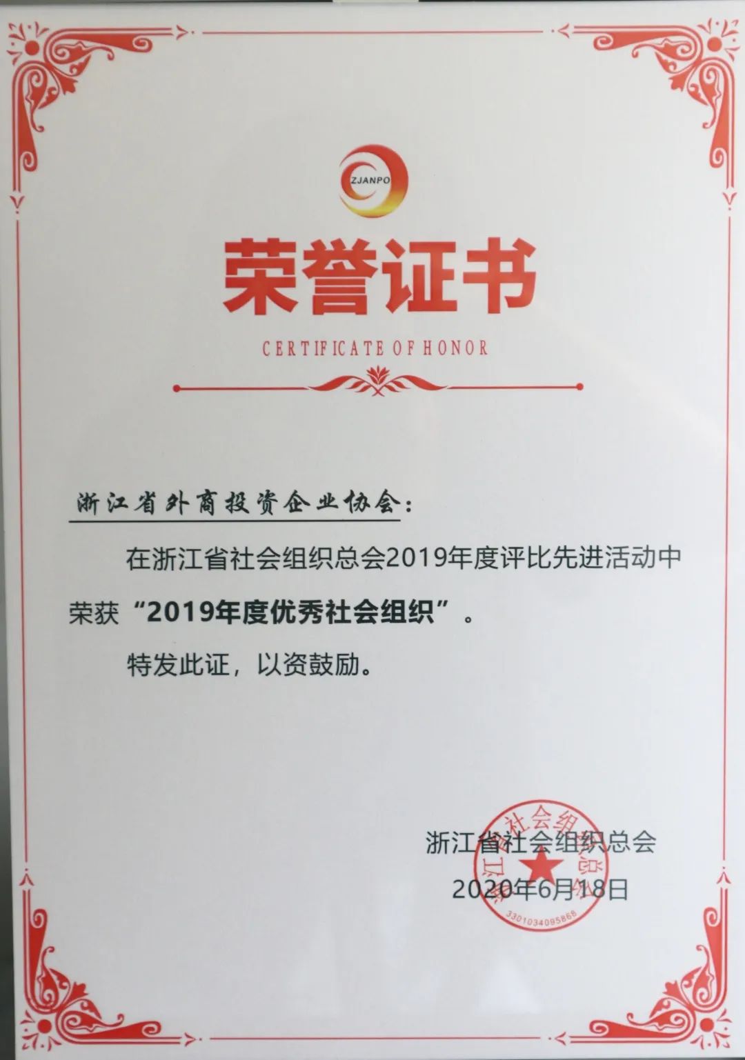 浙江省外商投资企业协会在此次评选活动中荣获“2019年度优秀社会组织”和“2019年度评估优胜奖”,协会副会长兼秘书长谢春叶荣获“2019年度优秀社会组织工作者”。